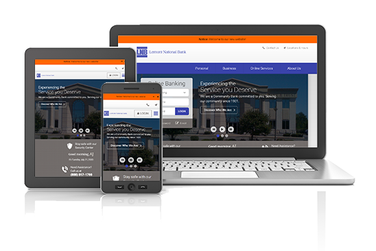 Welcome to Lemont National Bank. Our new website allows you to access your accounts and learn about new products easily from all your devices. |